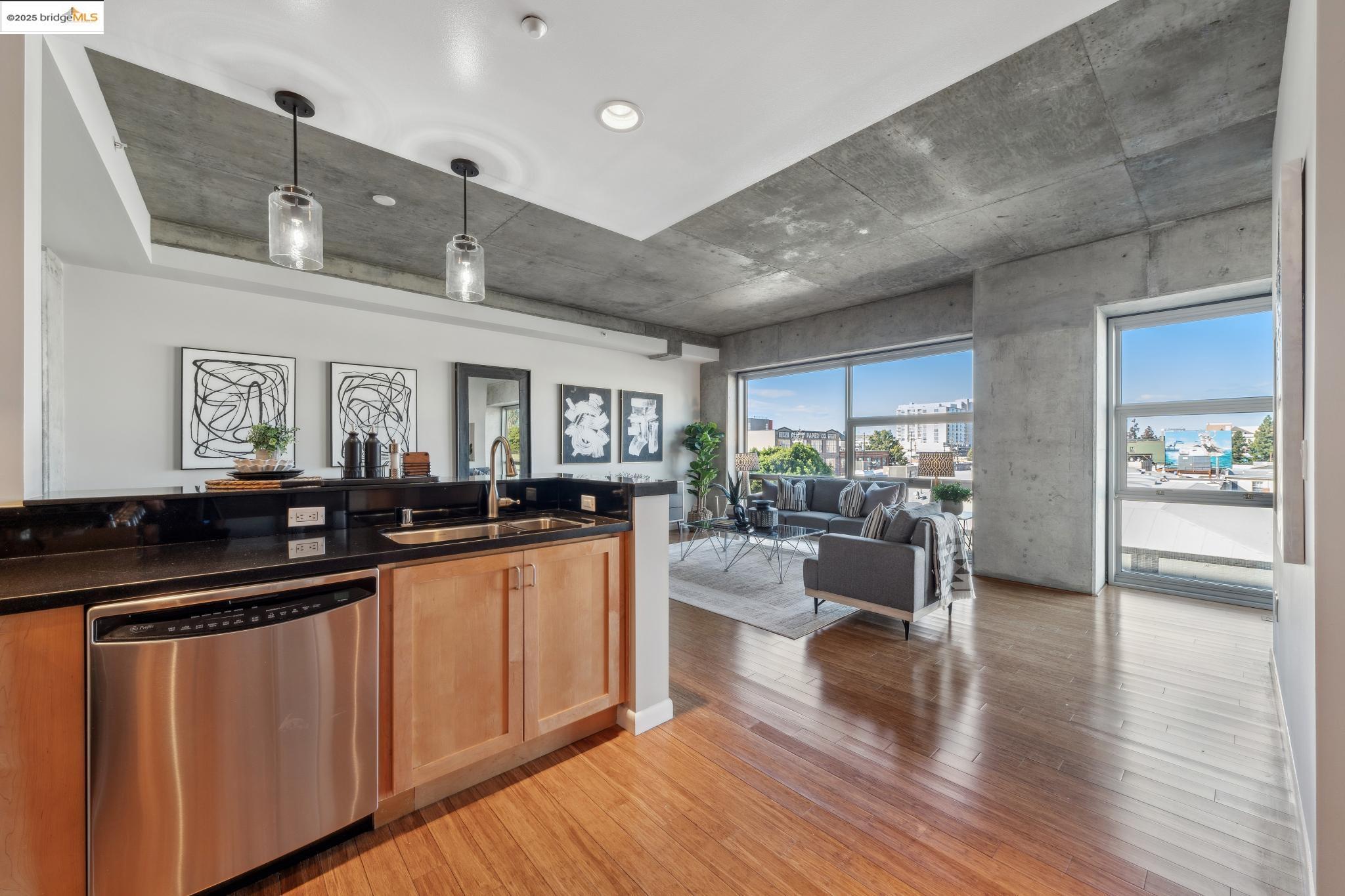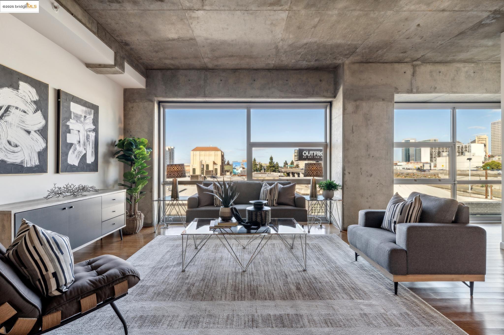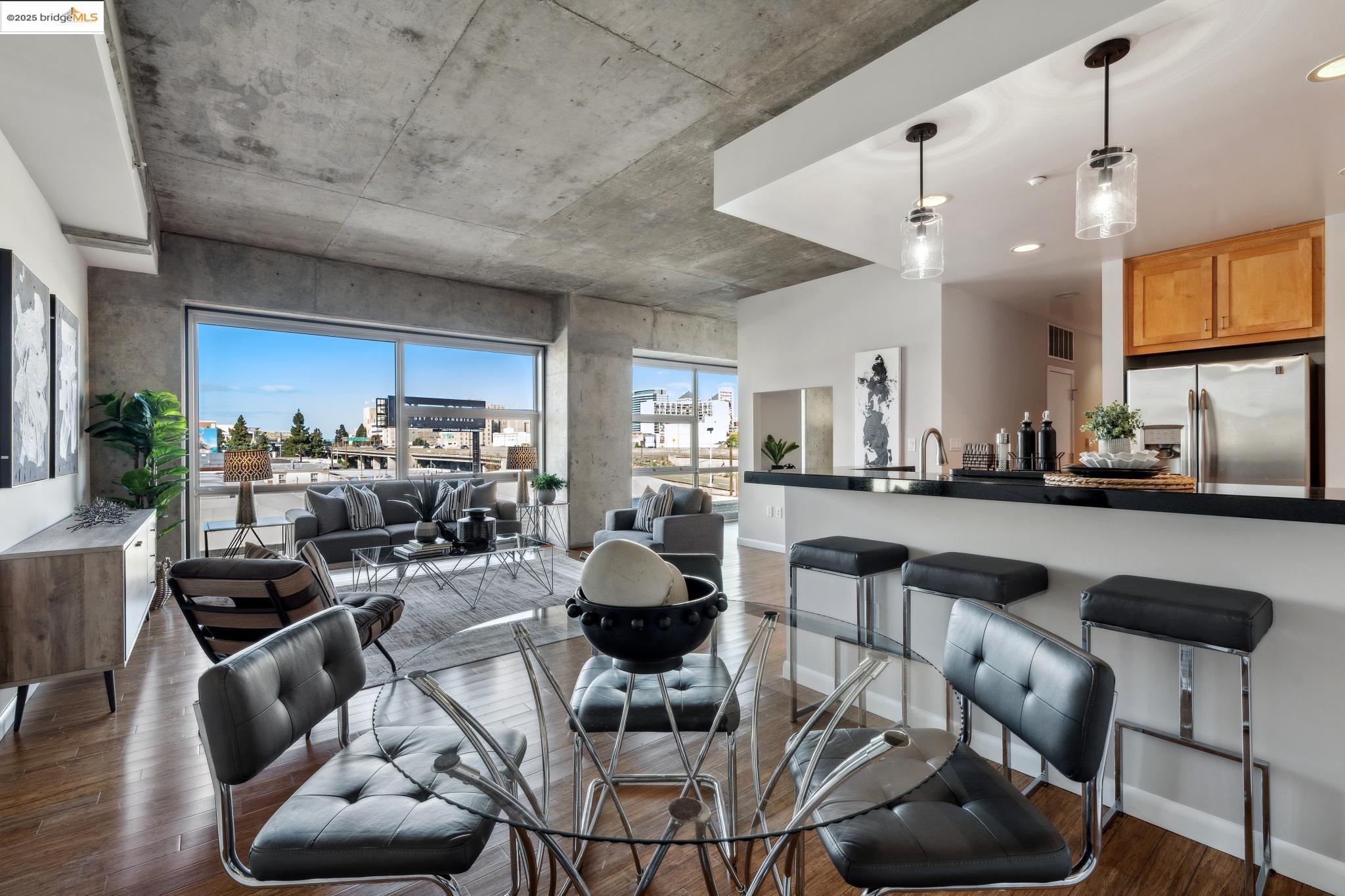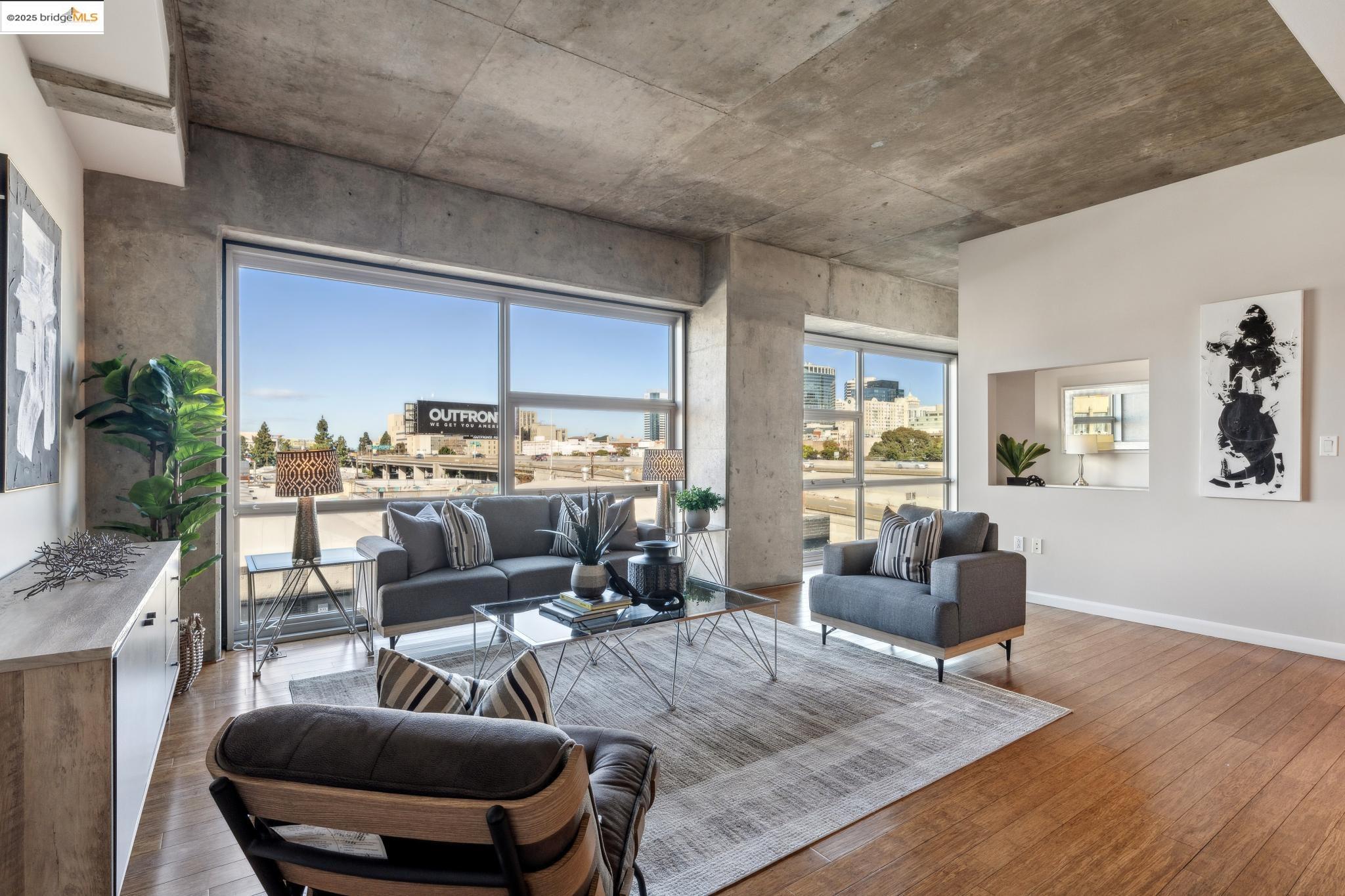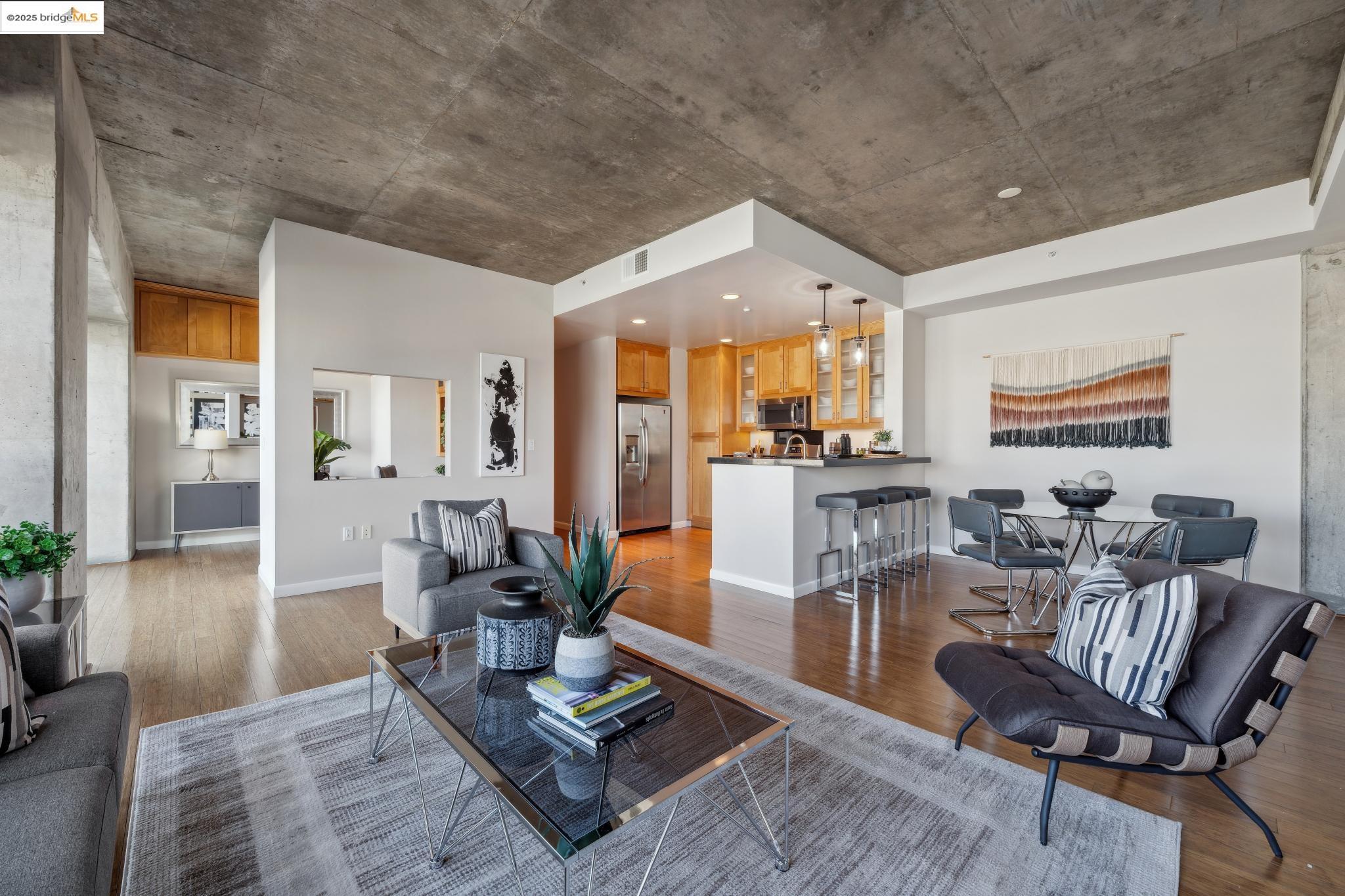 Welcome to urban living at its finest! Nestled in the heart of Oakland, this chic 2-bedroom, 2-bathroom condo at 428 Alice Street, Unit 422, offers a spacious 1,264 square feet of modern comfort. Revel in the industrial views with twinkling city lights from your expansive great room, where the kitchen, dining, and living areas blend seamlessly. A clever pony wall separates a large alcove, perfect for your home office needs. This pet-friendly building boasts a suite of amenities, including central AC, new in-unit washer/dryer and gas range, with deeded parking. Stay fit with the on-site gym, and enjoy the convenience of an elevator for easy access. Located near the vibrant Jack London Square, you'll have shops, restaurants, and entertainment at your fingertips. With easy freeway access and proximity to downtown Oakland, commuting is a breeze, whether by car or public transportation. Embrace the modern lifestyle in this stylish condo, where comfort meets convenience in the heart of the city. Don't miss out on this gem!